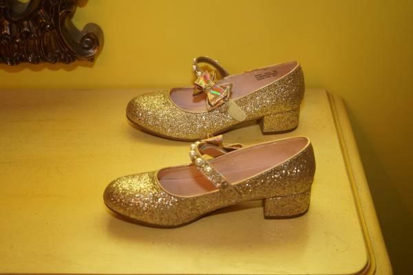 Girls Gold Sparkle Shoes Size 5 M One-inch heel Velcro closure adorned with pearls and bow All man-made materials Worn once inside only. Perfect for the holidays Sold with box in mint condition