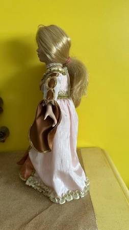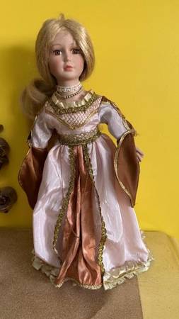 Porcelain Doll for Display purpose. Medieval dress made of polyester. Doll is porcelain on face, arms and legs. Torso is soft, stuffed material Secure and attached base.