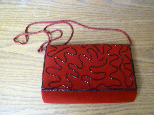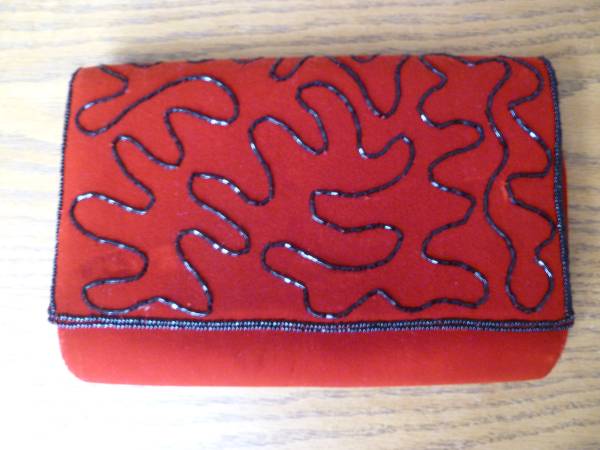 Like new! Vintage. Black beaded design on front. Braided rope design strap to use on shoulder or tuck inside and use as a clutch purse. Small inside pocket. Snap closure. Approximately 9" x 6". No...