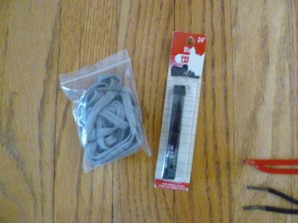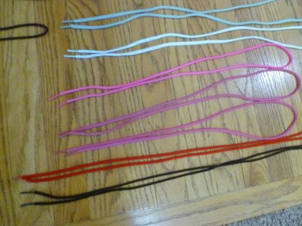 Some new. Some like new. Some very light use. Various colors, sizes, and types. Measured shoelaces at full length and not as folded in pictures. Measurements are approximate. Includes: 1 light gray-50", 1 light gray-51 1/2", 1 hot pink-41", 1 red-56", 1 gray-45 1/2", 1 gray 48", 1 pair gray-new in open package-52", 1 white-48", 1 pink-41", 1 pink-39", 1 pair gray-42", 1 black-43", 1 pair black-43", 1 pair black-27", 1 brown-72", 1 black dress lace new in open package-24", 1 black-33", 1 brown-25", 1 brown-29", and 1 black-29". $5 for all.