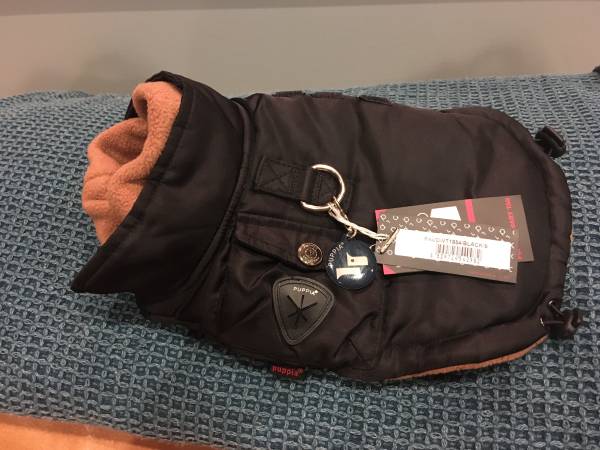 Brand new winter coat by Puppia. Puppia size S, which is regular size XS for dogs under 5 lbs. Original price $78. Build in harness, no buckle, over the head, strong Velcro closing.