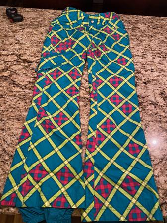 This is a wild patterned pair of girl's ski/snowboard pants. Juniors X-small Dryride. The main color is like a dark teal color, lime green/yellow criss-cross pattern with some hot pink as well. Multiple pockets and air vents as well. Adjustable waist 28" but can be tightened. Length is about 37" long with cuffs at bottom to go over the boots. Very nice pants! Like new!