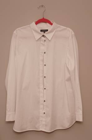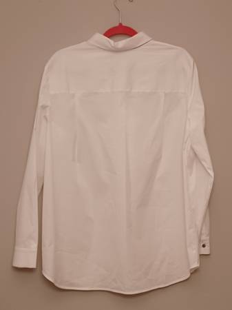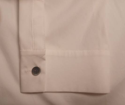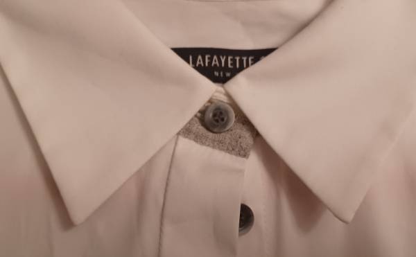 This feminine shape is contoured through precise French darting, while a high architectural collar, clean back yoke and shirttail hem lend to its structured form.