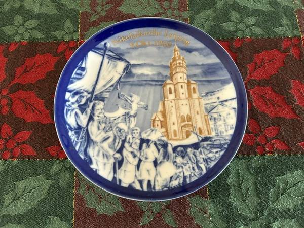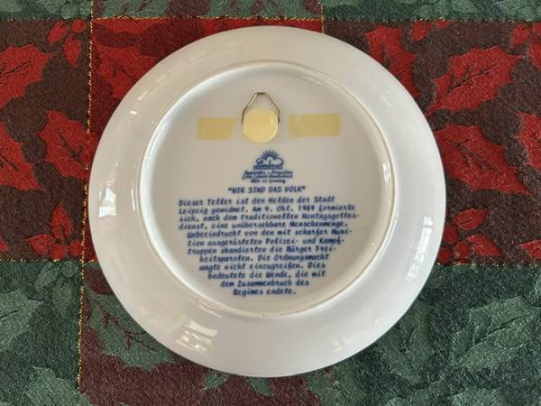 Rare Antique Bavarian Porcelain Elegant Plate - Vintage Lindner - Diameter 7 7/8" Front: NikolaiKirche Leipsig, 9 Okt. 1989 Back: "Wir Sind Das Folk" Good condition, the tape that was over the hook...