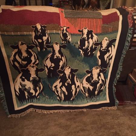 Farm wall Art, 9 Cows in the Yard, Good used Condition, size is Approx 5' x 5' . $15 , Can be used for a chair throw or hang on the wall. Call and leave a message.
