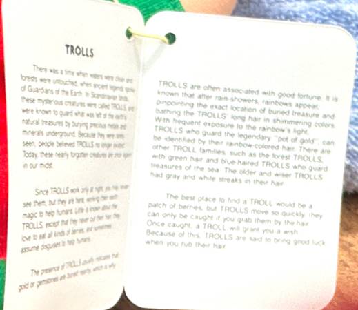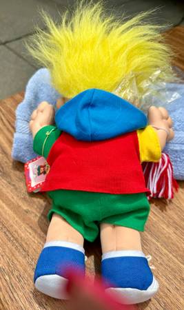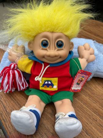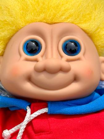 This Troll Buster Doll has a hard plastic head, a soft cloth body, bright Blue Eyes and is dressed in a colorful outfit including a hoodie, shorts, and shoes. Buster is known for his bright yellow hair, blue eyes, and a cheerful expression. He is a vintage item and a popular collectible for those who enjoy nostalgic toys.