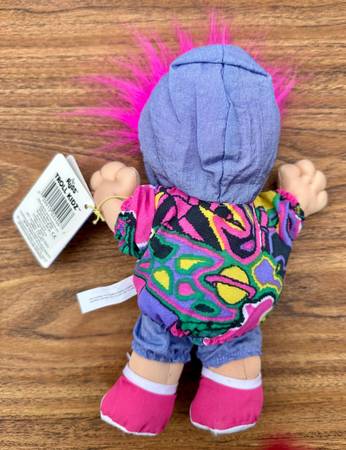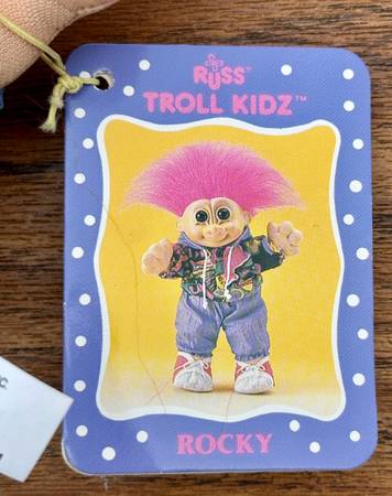Hair: The doll features bright pink, spiky hair, a signature characteristic of troll dolls. Outfit: Rocky is dressed in a colorful windbreaker jacket and blue jeans, typical of the "Troll Kidz" line. Tag: The doll still has its original tag, indicating it's likely a collectible or vintage item. Brand: It is a Russ Berrie product, a company well-known for producing troll dolls.