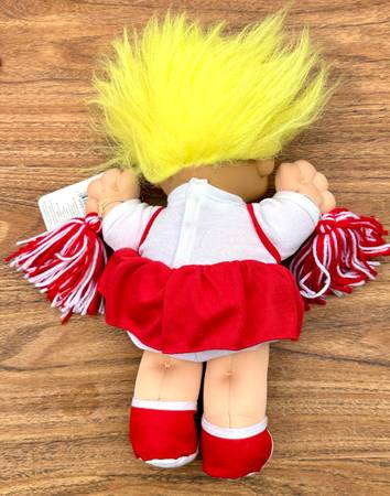 Vintage-New Blue Eyed, Pink hair in a Red& White Cheerleading outfit. Both arms with a Pom Pom. New with tags.