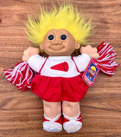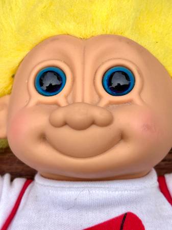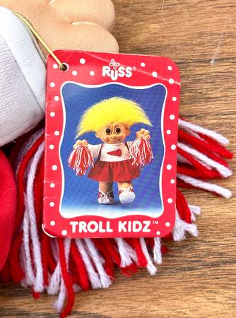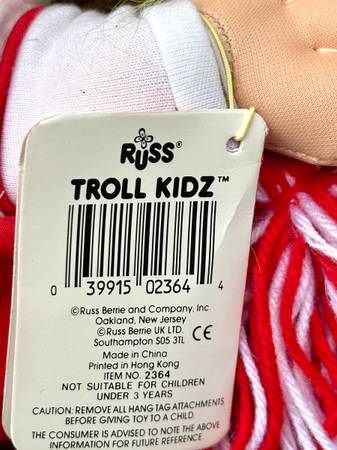 Tag: The doll still has its original tag, indicating it's likely a collectible or vintage item. Brand: It is a Russ Berrie product, a company well-known for producing troll dolls.