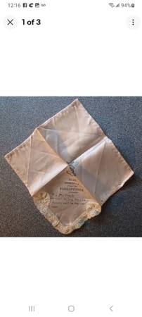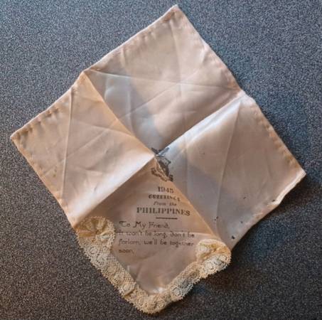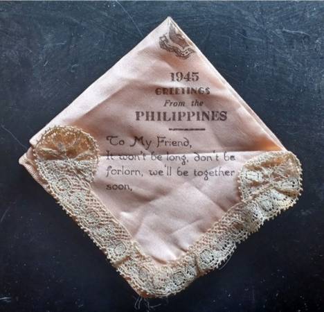 VERY RARE VINTAGE 1945 USMC PHILIPPINES SILKY, EMBROIDERED HANDKERCHIEF.