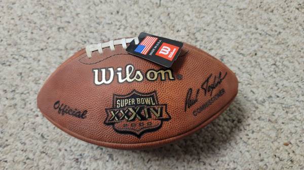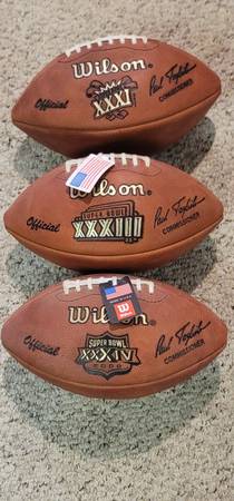 Brand new Wilson Official Super Bowl XXXI, XXXIII and XXXIV Game Balls. These footballs are primarily for display. Since the footballs are over 25 years old and most likely the bladder will break or leak if inflated with air.