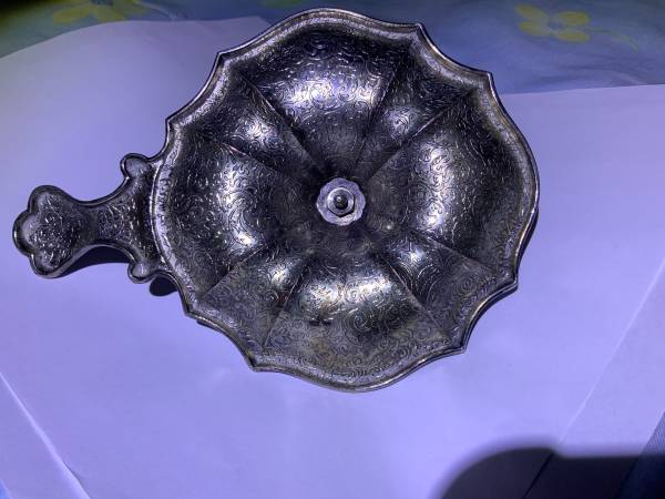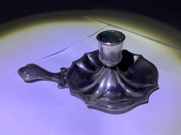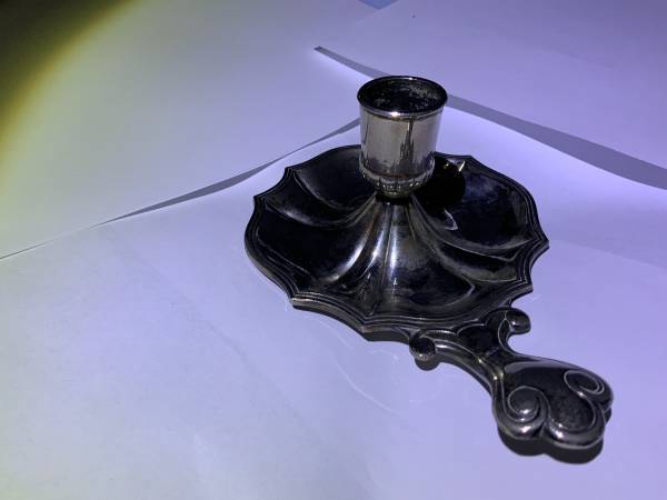 Antique / Vintage Silver-Plated Chamberstick Candle Holder – Ornate Victorian Style Beautiful antique/vintage chamberstick candle holder with ornate floral scroll engraving and scalloped drip pan....