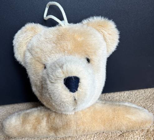 A rare vintage plush teddy bear clothes/door hanger, likely from 1987 or the early 1990s. This charming piece features a soft, light-tan teddy bear head and arms, designed to hang on a closet rod or door.