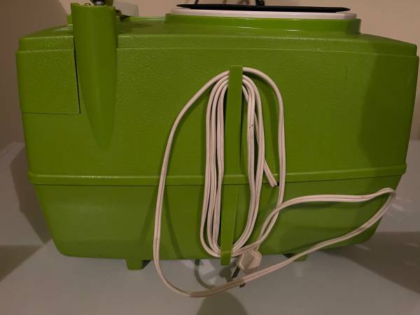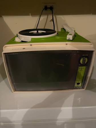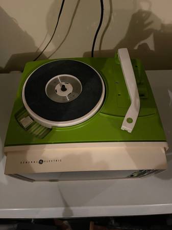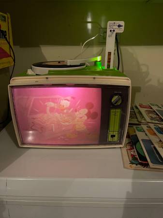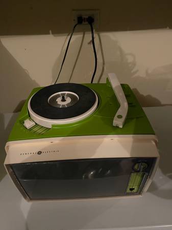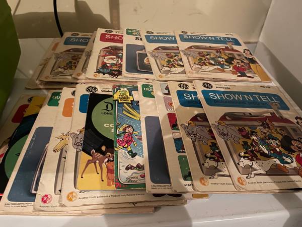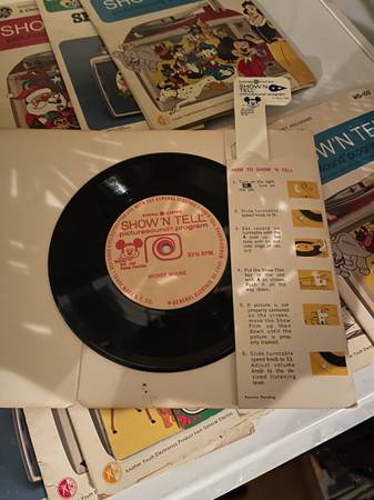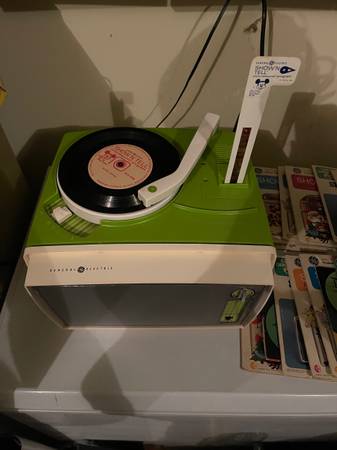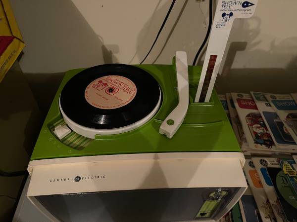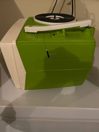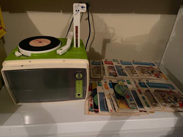 This is a 1960’s mid century record player that plays kid’s records with film, and it also plays regular records. Everything functions (except it needs a needle).