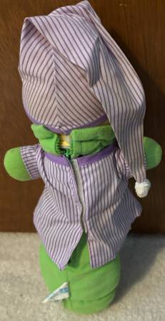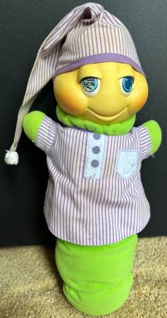 Selling a classic piece of 1980s nostalgia: a vintage Hasbro/Playskool Glow Worm (or "Glo Worm") plush toy. This is the recognizable model with the purple-and-white striped pajamas and nightcap.