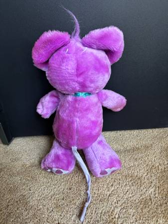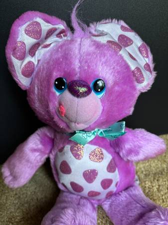 Color/Pattern: Bright purple fur with sparkly heart-shaped "chip" spots on its belly, paws and ears.