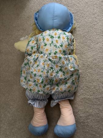 - Doll features blonde yarn hair in braids, blue bonnet, floral dress, striped bloomers, and soft blue shoes.