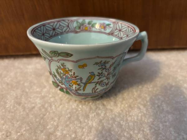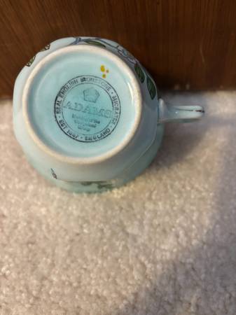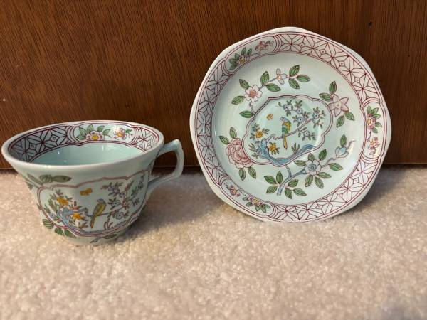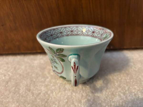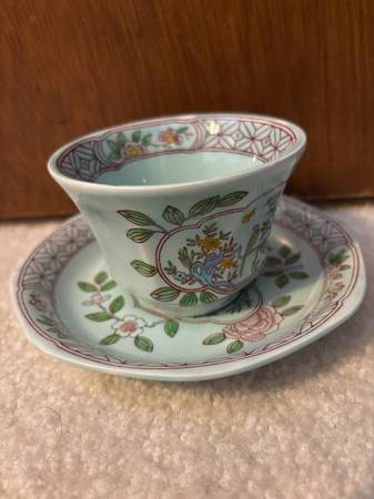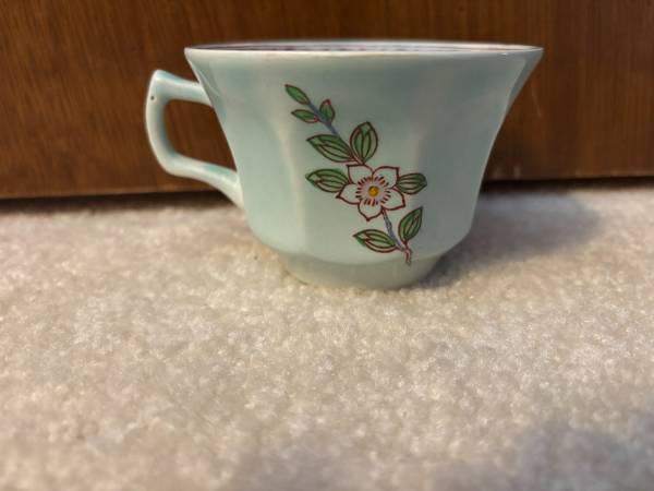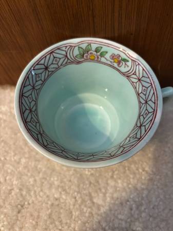 Condition: Very good overall, but there’s a tiny chip on the cup handle and a couple of small glaze skips on the rim. These are minor and don’t affect display.