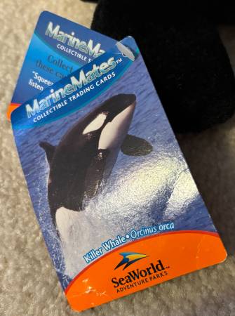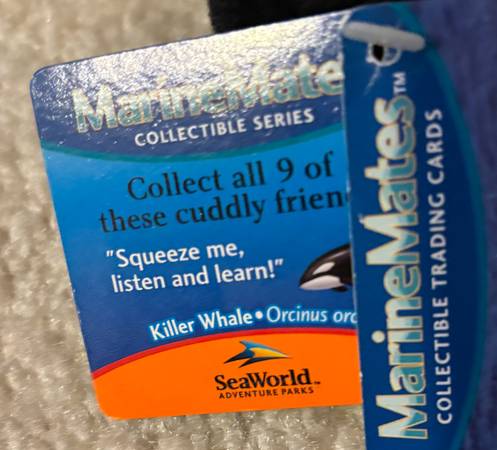 This plush is from the "MarineMates Collectible Series" and is a great piece of SeaWorld memorabilia. It is identified as a "Killer Whale • Orcinus orca" on the tag, and does not feature the name "Shamu."