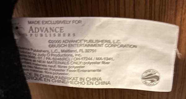 Feature Note: The original hang tag says "Squeeze me, listen and learn!" and there is a "PRESS HERE" sticker on the side, but the sound mechanism is no longer working. This is common for electronics in vintage plush toys.