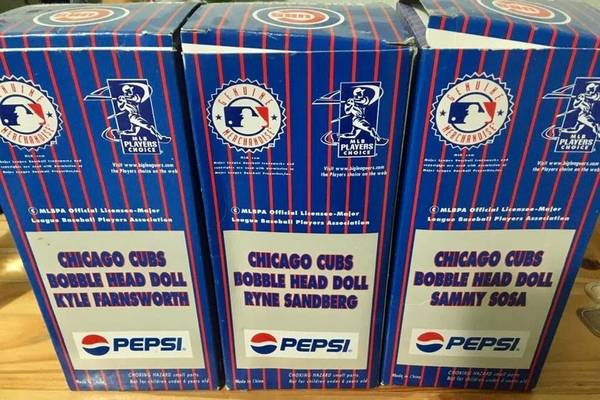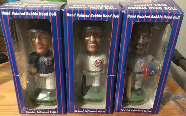 Set of 3 amazing looking Chicago Cubs Bobble Head Dolls- complete in their original packaging, never even displayed! Ryne Sandberg/ Sammy Sosa/ Kyle Farnsworth Bobbleheads Special Collector Series,...