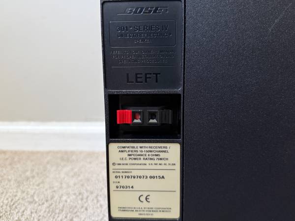 Bose 301 Series IV bookshelf speaker system. These are fully working and in good condition, black color! Bose sound quality, perfect for bookshelf speakers or surround speakers! I will have them connected to the garage stereo so you can hear them before buying! The price is $150 firm, not negotiable.