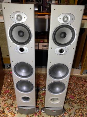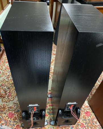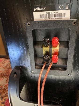 Great sounding pair of Polk towers. Clean cabinets in a black oak veneer. Terminals are solid. All surrounds are original rubber so they don't rot like foam over time. All drivers are working. These are heavy speakers. Nice small footprint if space is an issue! They are double ported - mids and woofers are separate ports. They are capable of bi-amping with terminals that are woofer and mid/highs separable.