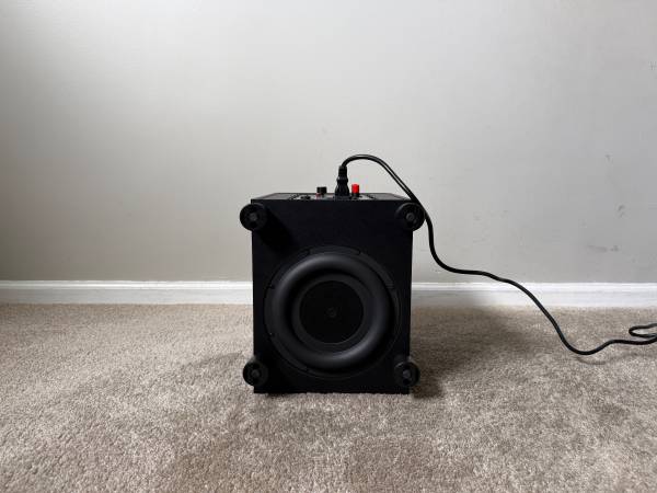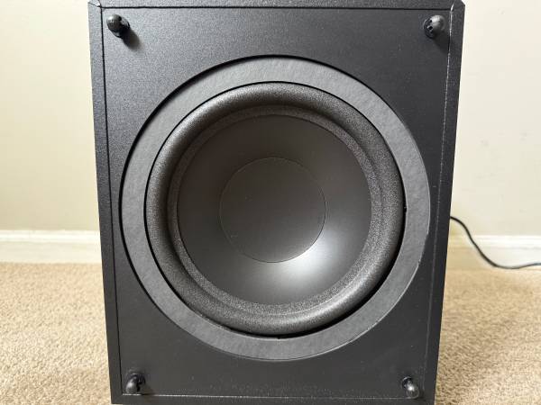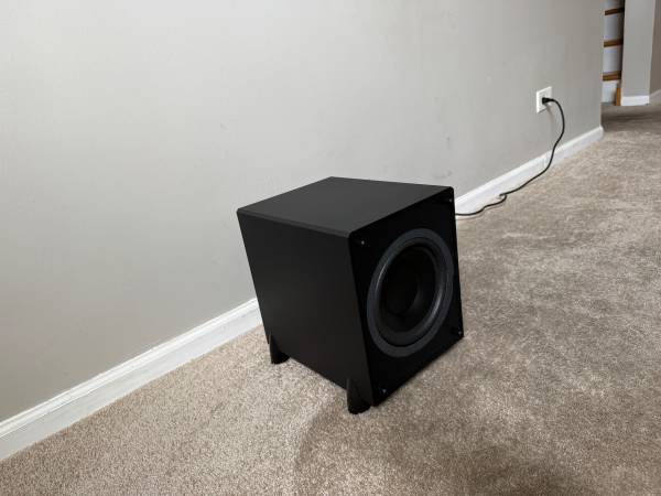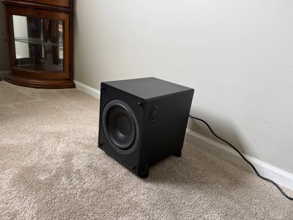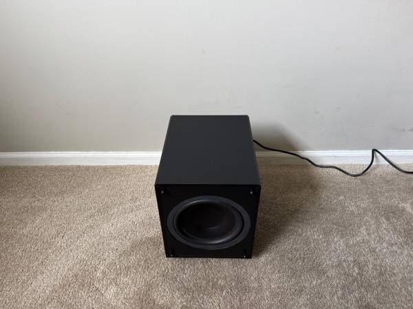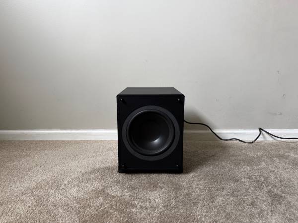 Definitive Technology Pro Sub 600 powered active subwoofer. The sub is fully functional and in great shape, 8" woofer in front and a passive woofer at the bottom that makes the bass very smooth. It goes loud but don't expect much from an 8" woofer. Great for a sound bar or a home theater system. Dimensions: 10.25" Wide, 13" High and 15" Deep. I will have it hooked up to the garage stereo so you can hear it before buying! The price is $80 firm, not negotiable!
