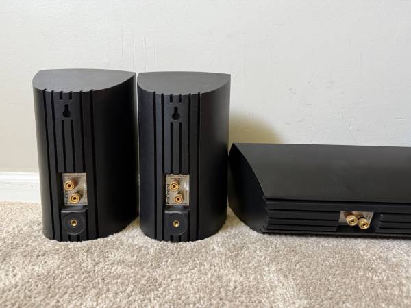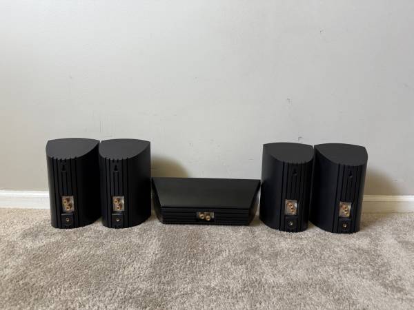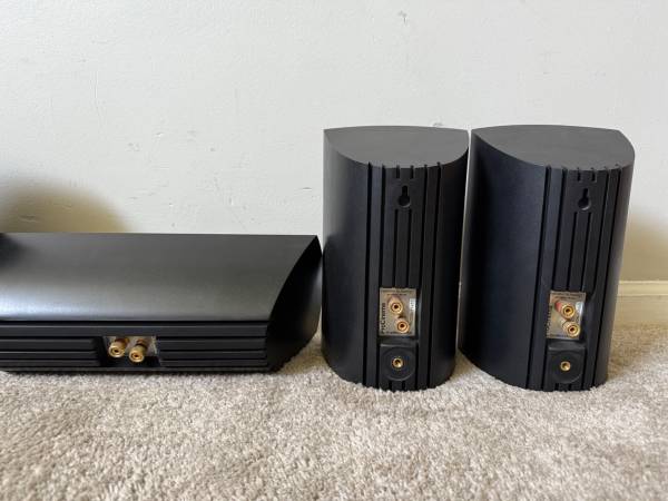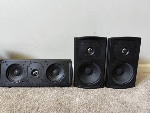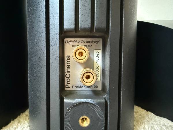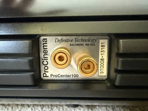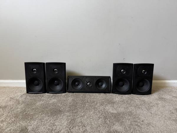 Definitive Technology Pro Cinema Monitor model 100 2 front, 2 rear and 1 center home theater surround satellite speaker system. The front and surround ones are ProMonitor 100 and the center channel is ProCenter 100. Tested and working great. They can be easily attached to the wall or to speaker stands. I will have them connected to the garage stereo so you can hear them before buying!! The price is $100 firm, not negotiable.