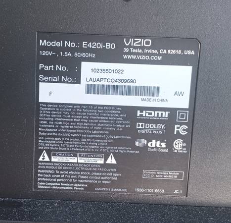 Pre-owned 42" vizio e420i-b0 2014 e series. Pickup in Mt. Prospect. Wall mountable. Works fine. No remote or stand.