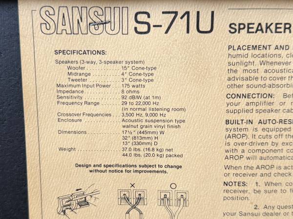 Up for sale is a pair of Sansui SP-71U 3 way home floor standing vintage loudspeaker system in good working and cosmetic condition. Each speaker has 15" woofer, 4" midrange, 3" tweeter and rated 175W, if you want to have it loud, these are the loudspeakers for you! Dimensions: 32" High, 13" Deep, 17.25" Wide and 37lbs heavy! I will have them connected to the garage stereo so you can hear them before buying! The price is $200 firm, not negotiable.