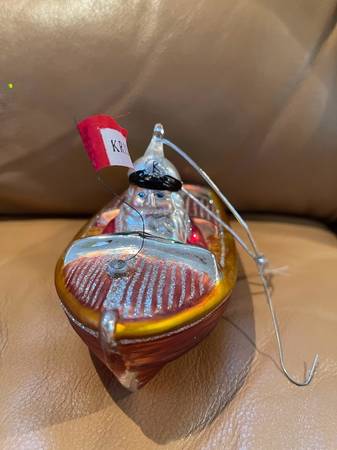 Dept. 56 Christmas Ornament - Santa in a Boat $18.00 OBO Dept 56 Mercury Glass Santa in Speed Boat Ornament #02363 Hand Painted 7" Euc. Condition is "Used". Santa is driving the boat with a Kris tag...