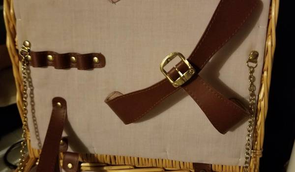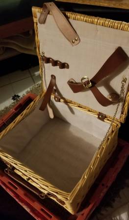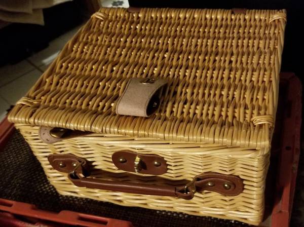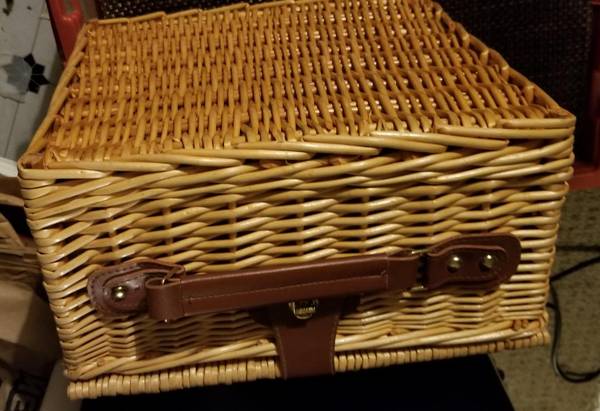 13" WILLOW PICNIC BASKET. Accented with two faux leather and brass clasps. Size: 13" x 12" x 7"