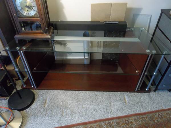 Custom made beautiful TV stand Like new conditions Solid and quality build 1/2" tempered two glasses shelf and side shelf W 58 - D 18 - 23 H was cost not cheap for me.