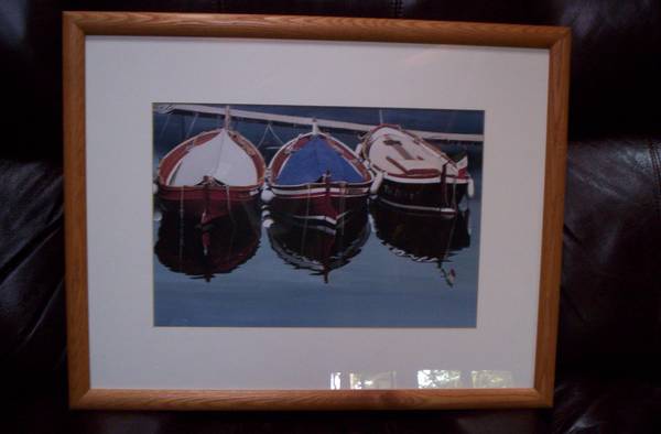 Gallery Framed Artwork Three Wooden Sailboats that measures 23 1/2"W x 18 1/2"H. Ivory matting in a 1" oak frame.