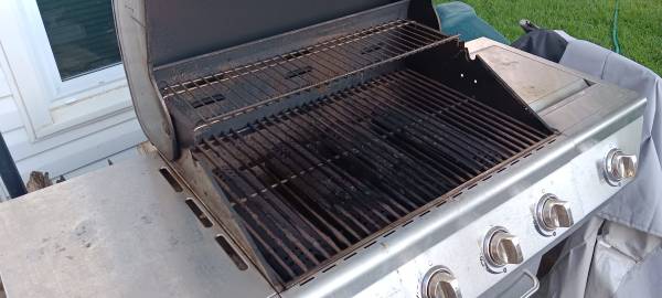 Stainless steel Nexgrill four burners with an extra cook burner on the right five burners total stainless steel push button start hundred bucks at yours if you see this ad yes it's still for sale you like it make a reasonable offer it's yours start cooking tonight thanks for looking