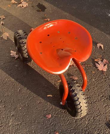 Tractor seat with 360* radius. Plastic wheels never need inflating. Seat is 14” high. Unit is 39” long. Perfect height for tooling on the bike or building in the garage. Saves the back and makes it...
