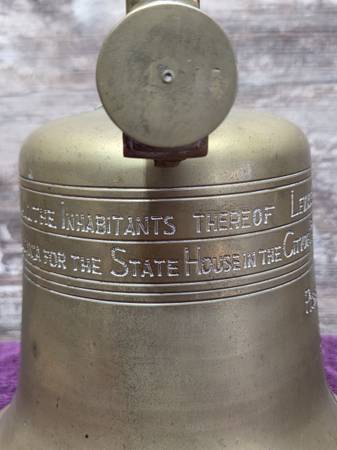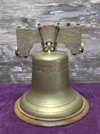 Pick up in Richmond IL Made in India in excellent condition. Sits on a wood base that is about 1" thick by 10 1/2" wide, the bell is 10 1/2" by 9" wide and weights approximately 2 lbs.