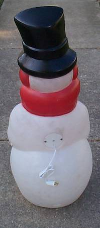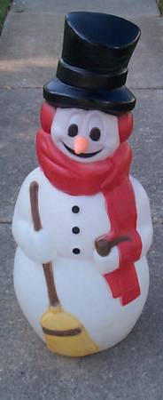 Here is a Vintage Blow Mold Snowman. This collectable is the one with the carrot nose and is considered to be more rare than other blow mold snowmen. It was manufactured by the General Foam Co. It stands about 43" tall and should be considered to be in excellent condition, great colors. In addition, it comes with a brand new cord for lighting. Priced to sell. Can anybody use this? Pleae call or email. NO text. show contact info