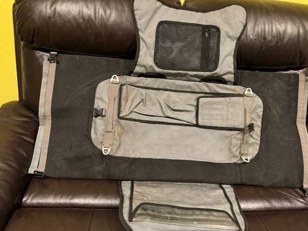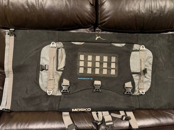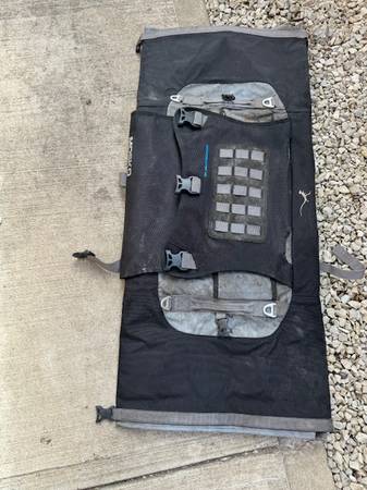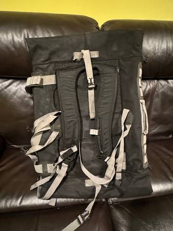 Duffle / backpack bag. MOLLE expandability; 2 bag system (tough bag outside - dry bag inside); beavertail stash-spot for extra storage and expansion; double ended roll top- access from both sides; deployable backpack straps; built-in tent pole pocket; document / mop pocket.