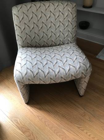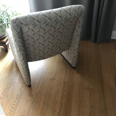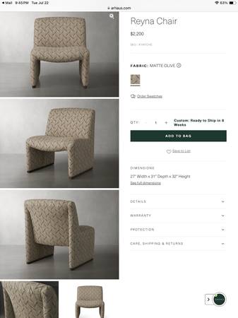 Modern style textured Custom Matte Olive fabric with black legs. Fabric is nice and durable and stain-resistant 32”H x 31”D x 27”W less 6 months old. Chair is on display at Arhaus showrooms CASH ONLY