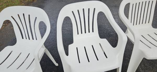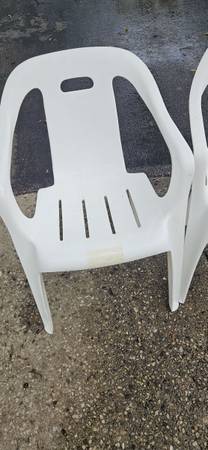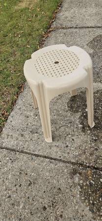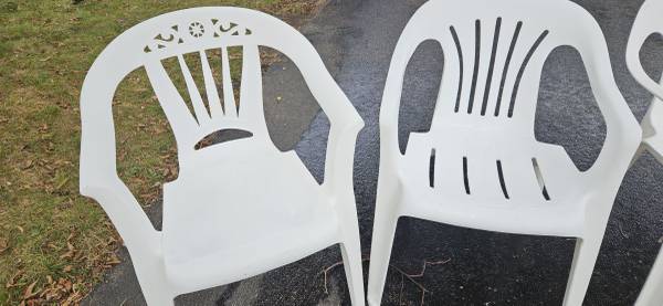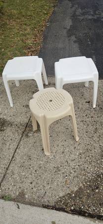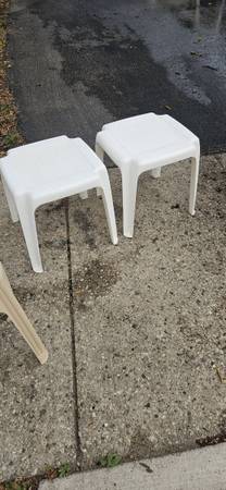 2 White End Tables (16" high) = $7 each 1 beige End table (17.5" high) =$7 Set of 2 matching white chairs = $15 1 single white nonmatching chair (4 available) = $7 each