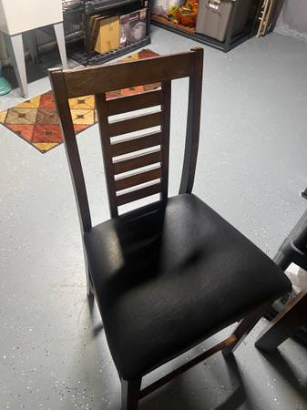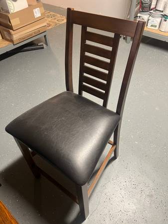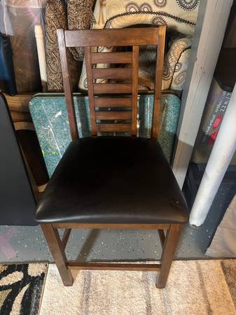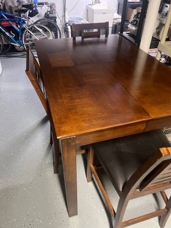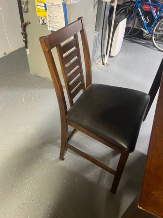 Solid Oak bar height table with 4 paded chairs 54 L x 36 W x 37 Height 4- Black high back chairs with pads Excellent condition