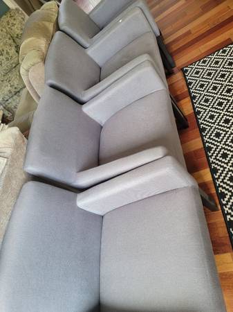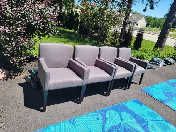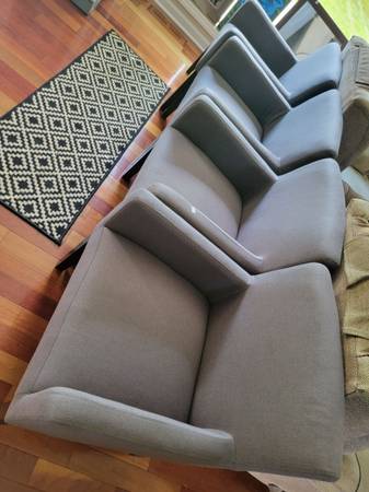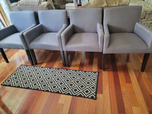 Set of 4 beautiful Grey upholstered dining chairs with back rest and arm rest. Excellent condition. Set of 4. $150 firm. Cash only, no bills over $20. You pick up.