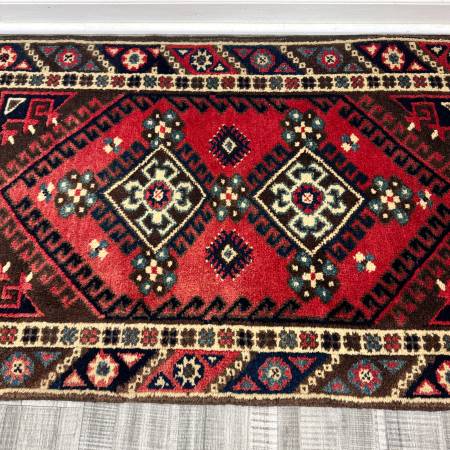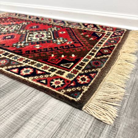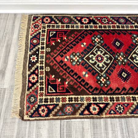 This small vintage rug showcases vibrant colors and a lively geometric design. A plush rug, it has recently been professionally cleaned. Maker is unknown. Please review the photos for further...