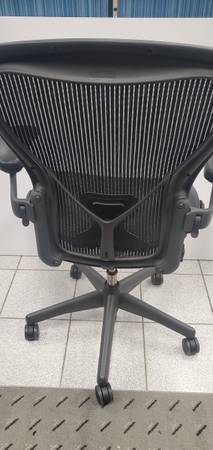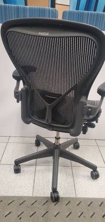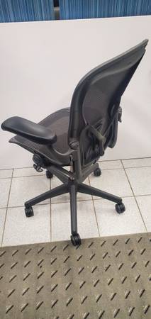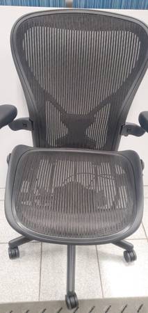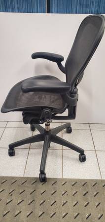 HERMAN MILLER AERON POSTURE FIT SIZE B. FULLY LOADED. FULLY REFURBISHED. 30 DAY MECHANICAL FAILURE WARRANTY. BLACK ON GRAPHITE FRAME. REAR AND FORWARD TILT LOCK LIMITERS. FULLY ADJUSTABLE VINYL ARM PADS. ADJUSTABLE POSTURE FIT. FLIP LEVER.