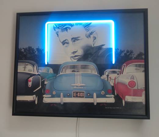 James Dean drive inn movie picture with neon. Artist - Walter Rockwood Ferris 11. size - 29"l x 23 1/4 h x 3 1/2 "w Black frame. $200.00 Call for info- No text messages.