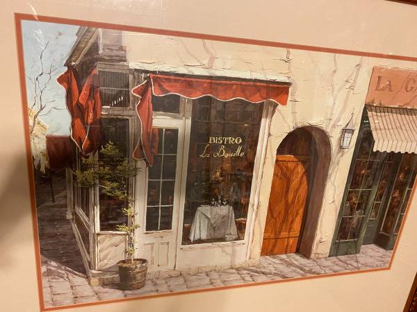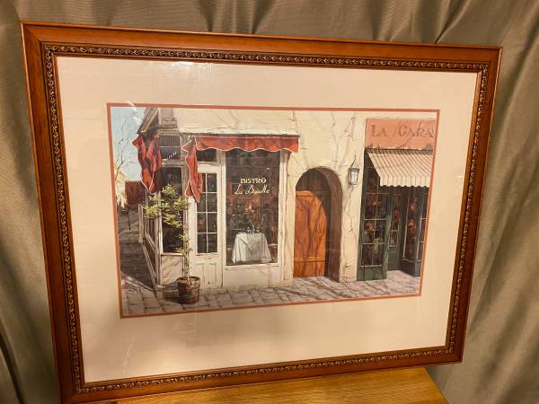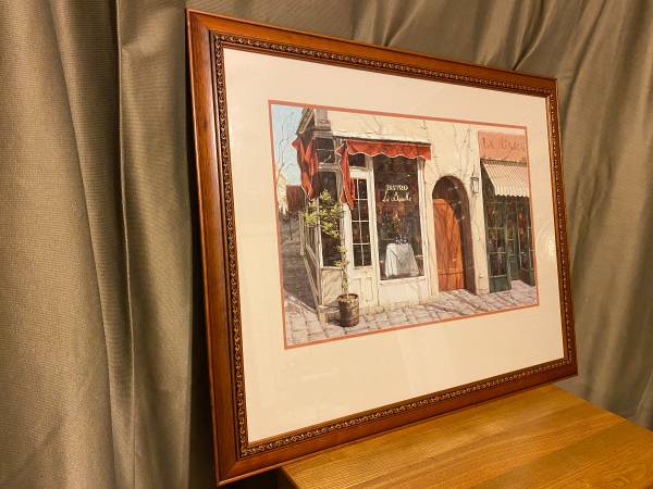 Large Bistro Wall Art by Viktor Shvaiko in a custom made glass and wood frame in great condition. Dimensions: 40.5" X 32.5" A great accent piece on any room. Thanks for looking- $125