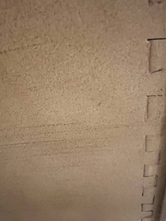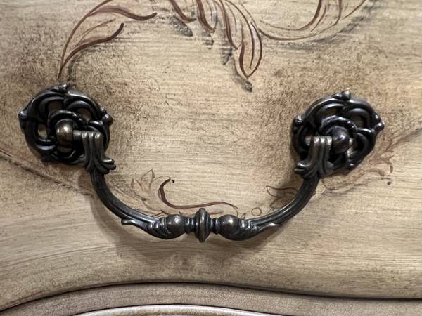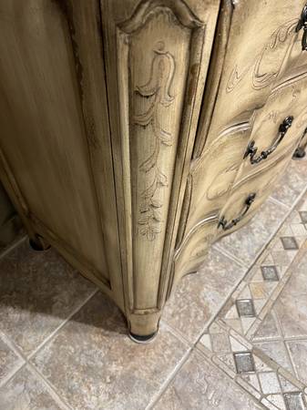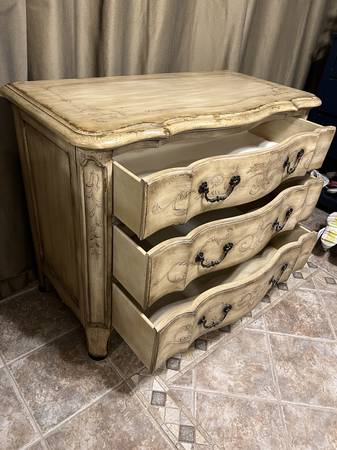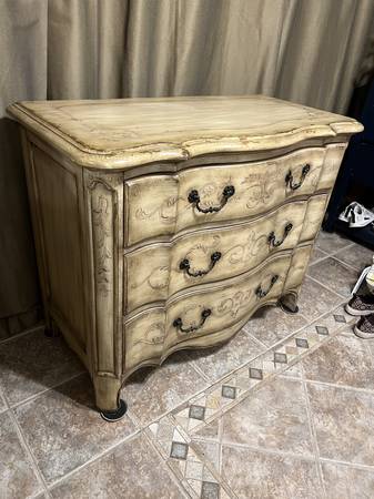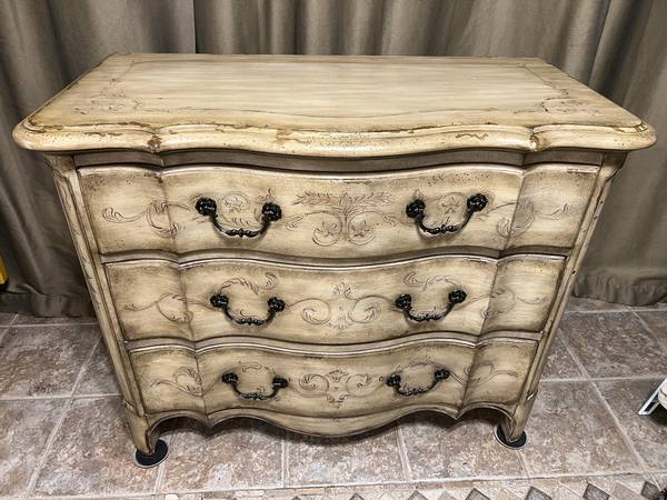 Hand painted designer chest of drawers with elegant details. Features distress design with three dovetailed drawers in great condition. Can also be used as buffet, entrance table, sideboard, dresser, storage cabinet, console table, tv stand. lcd stand Dimensions: Dresser Tall-34" Wide-43" Deep-21" I can help carry this out to your vehicle- $325