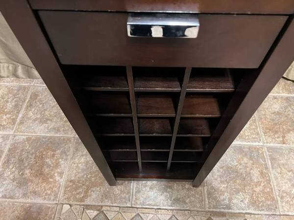 Space Saver Espresso Narrow Bar Cabinet Wine Rack from Crate and Barrel. Features Glass holder on top. Storage shelves, a drawer in the middle with elegant hardware and wine rack shelf at the bottom in great condition. Dimensions: Tall- 66" Wide-17" Deep-17". Can also be used as display table, storage cabinet, bookshelf, bookcase, kitchen stand, Thanks for looking- $165